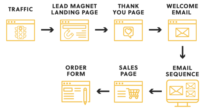 This flow creates a clear path: traffic → landing page → email list → relationship → revenue.